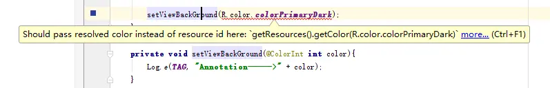 以上基本上包括了所有的资源类型,但是有时需要通过RGB颜色整型来设置颜色值,在这种情况下,你可以使用@ColorInt注解,表示你期望的是一个代表颜色的整数值,如果使用不对同样也是编译不通过