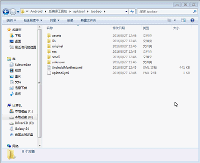 1.使用上述介绍反编译工具中的apktool,执行命令后得到程序的源代码、图片、XML配置、语言资源等文件