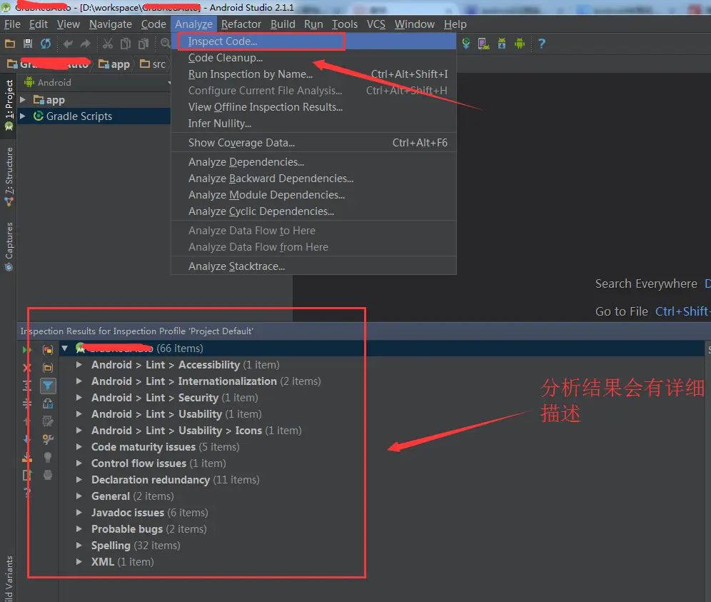 1.说明:通过Android Studio中的 Analyze->Inspect Code 对工程代码做静态扫描;找出潜在的问题代码并修改。里面也会包括很多安全隐患。api的兼容性等等。