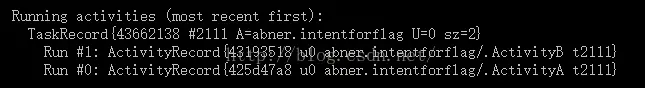2、FLAG_ACTIVITY_CLEAR_TOP:见名知意:清除当前Activity之上的所有实例,该Flag相当于Activity启动模式中的singleTask,例如,一个Activity栈中包含有A、B、C、D ,4个Activity实例,当在Activity D中以该旗标启动Activity B时,此时Activity栈中只包含A、B两个Activity实例。