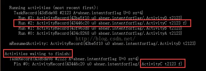 在ActivityD中以FLAG_ACTIVITY_CLEAR_TOP标志启动之前: 在ActivityD中以FLAG_ACTIVITY_CLEAR_TOP标志启动之后: |