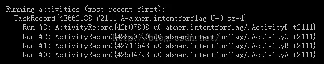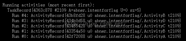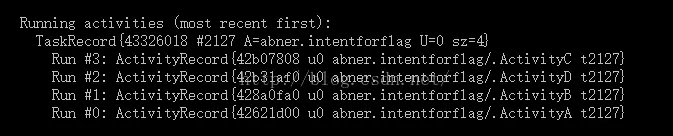 4、FLAG_ACTIVITY_SINGLE_TOP:从名字中不难看出该Flag相当于Activity加载模式中的singleTop模式,即原来Activity栈中有A、B、C、D这4个Activity实例,当在Activity D中再次启动Activity D时,Activity栈中依然还是A、B、C、D这4个Activity实例。