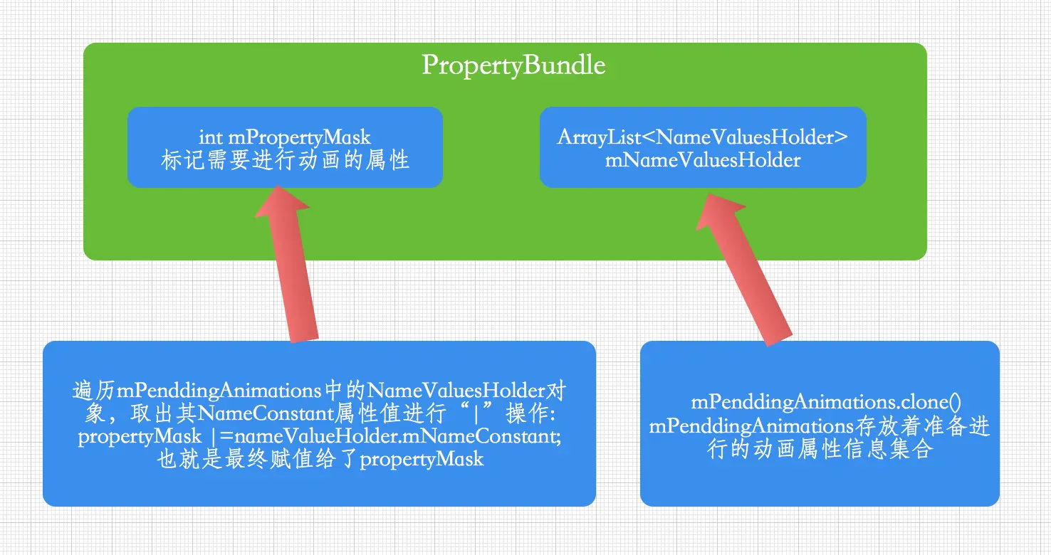 - clone一份mPendingAnimations列表,并计算属性值标记propertyMask,封装成PropertyBundle对象。