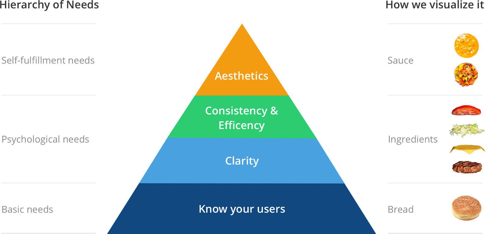 As we started to figure out what the design principles should be, we needed a better way to visualize them. Back in June, I wrote a Lyft redesign articleand talked about their design principles. They used a pyramid shape (Maslow’s hierarchy of needs) define the importance of order. It inspired me and I decided to give that a try.