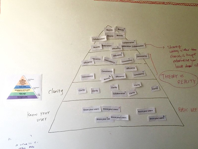 I printed out the design principles we created and cut them into pieces. I drew a giant pyramid on the white board and put a sample of Maslow’s hierarchy of needs next to it. Each of us got a set of principles and put them into the pyramid based on the way we wanted to rank them.