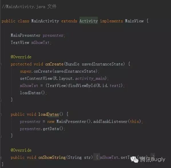 首先我们假设有一个从服务端获取字符串并显示的手机上的简单功能。下面是主界面的代码