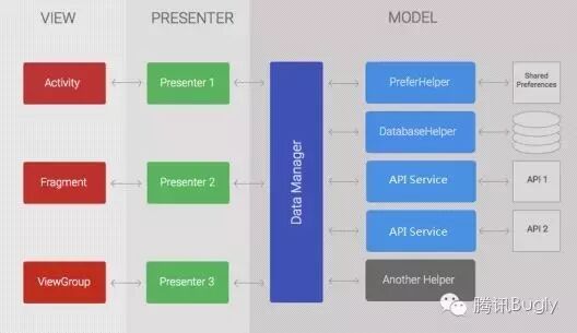 这是一个比较典型的MVP结构图(图片来自参考文献),相比于第一张图,多了两个层,一个是Presenter和DataManager层。