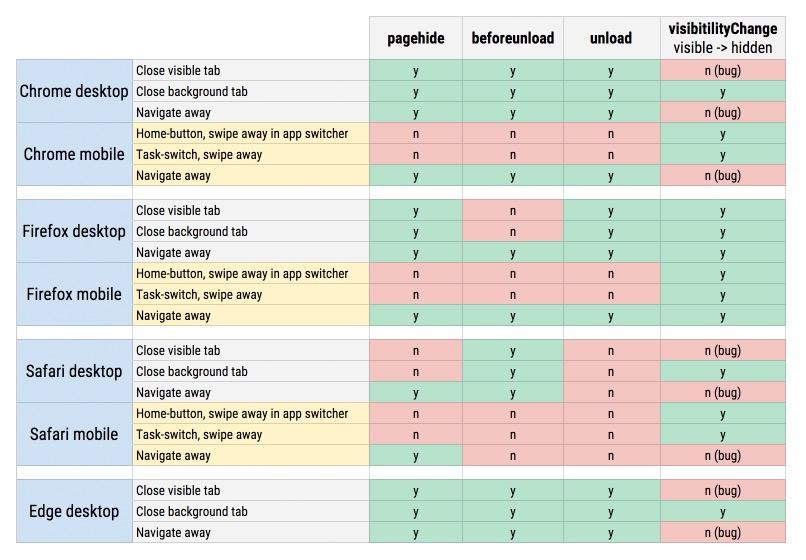 一般情况下,你只需要使用Page Visibility Api就够了。然而在今天,你可能会想讨论下pagehide,这算是当页面进入unloaded状态的一种特例。下面是一些主流浏览器在哪些情况下会触发哪些事件的一个简要说明: