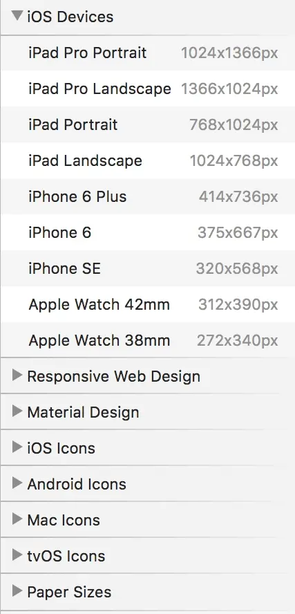 插入一个Artboard可以通过Toolbar最左边的Insert->Artboard选中,也可以通过快捷键A选中。选中之后,在界面右边Inspector面板会列举出很多可供选择的尺寸,你可根据需要选定你想设计的尺寸,如下图所示。我的界面Artboard就是选了iPhone 6那个尺寸。另外,也可以自己在画布中拖动出喜欢的大小。
