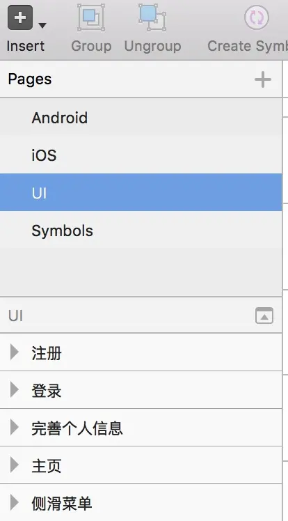 其次,使用File -> New出来的是一个sketch文件。一个sketch文件中可以新建多个Page,每个Page对应一个无限的画布,可以直接在画布里绘画,但一般都会在画布里插入多个固定尺寸的Artboard,然后在Artboard里绘画。如下图的例子,共有4个Page,名为UI的Page下为每个页面分别建立了Artboard,每个Artboard排列开来的结果就是上图的界面UI了。