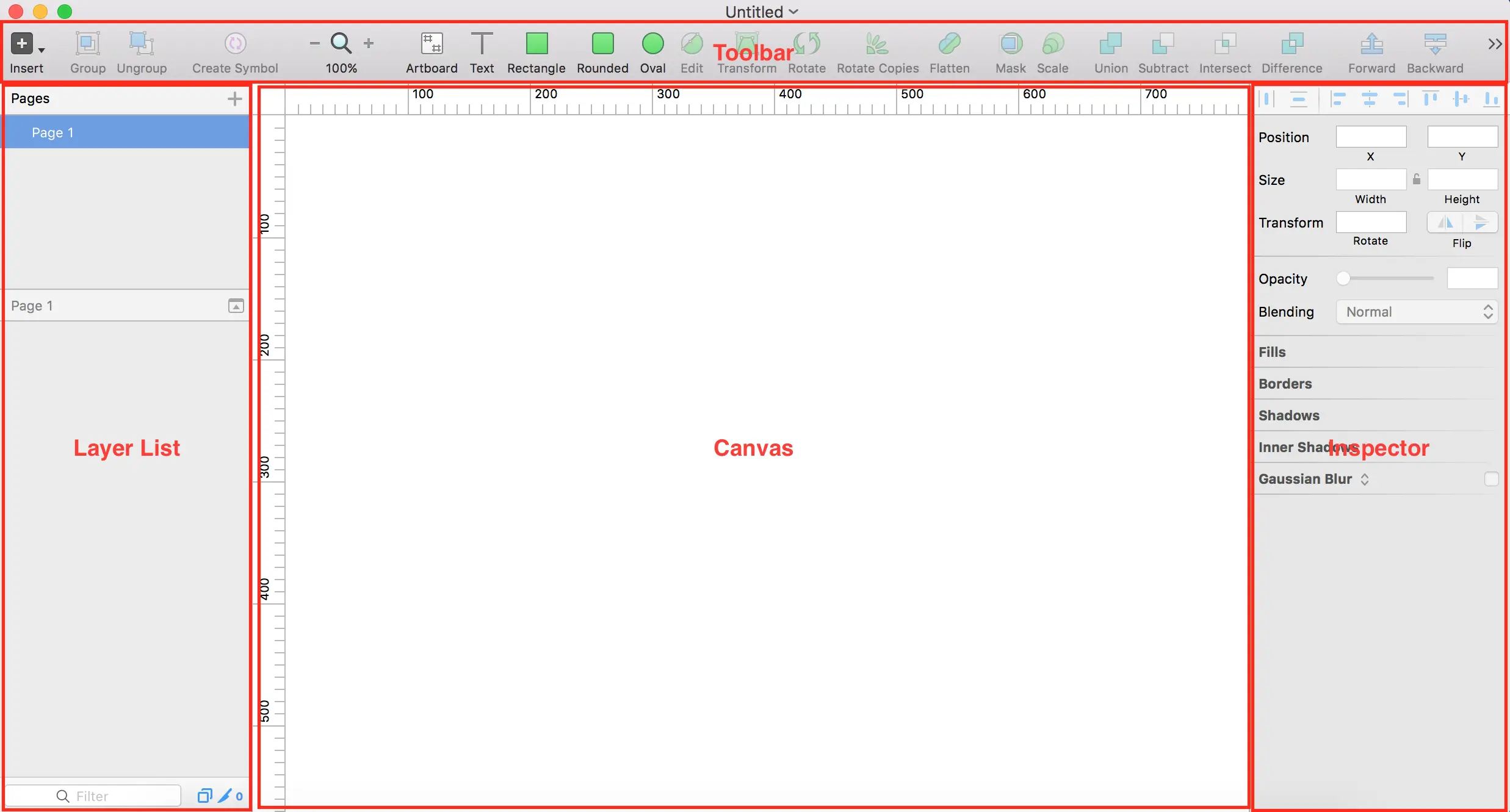 首先,Sketch的工作界面分为四部分。顶部的是Toolbar,包含了所有重要的工具和操作。右边的称为Inspector,可以用来调整被选中的图层的属性。左边是Layer List,列出了所有Page、Artboard和图层。中间就是Canvas画布了,所有设计就在这里了。