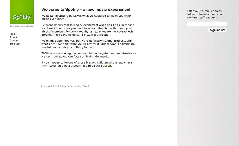 Daniel Ek和Martin Lorentz于2006年创立了Spotify。2008年它正式发布,beta版在2007年发布。从那时起到2016年5月,它已经汇集了超过1亿的活跃用户。