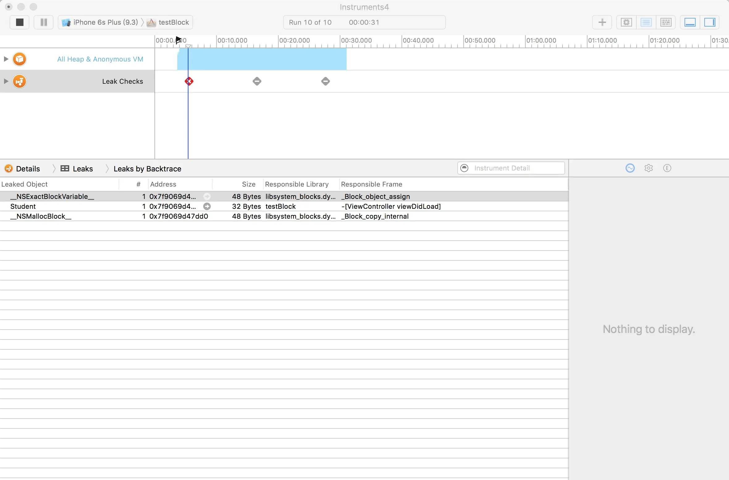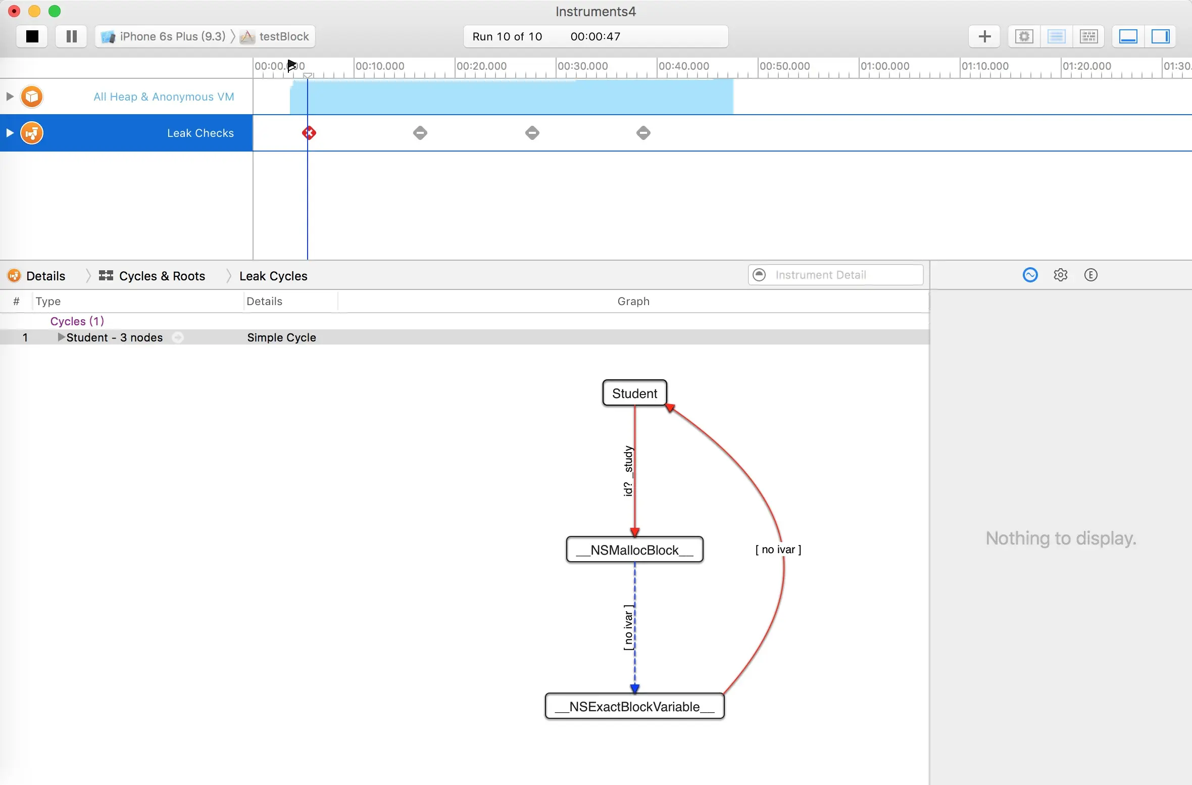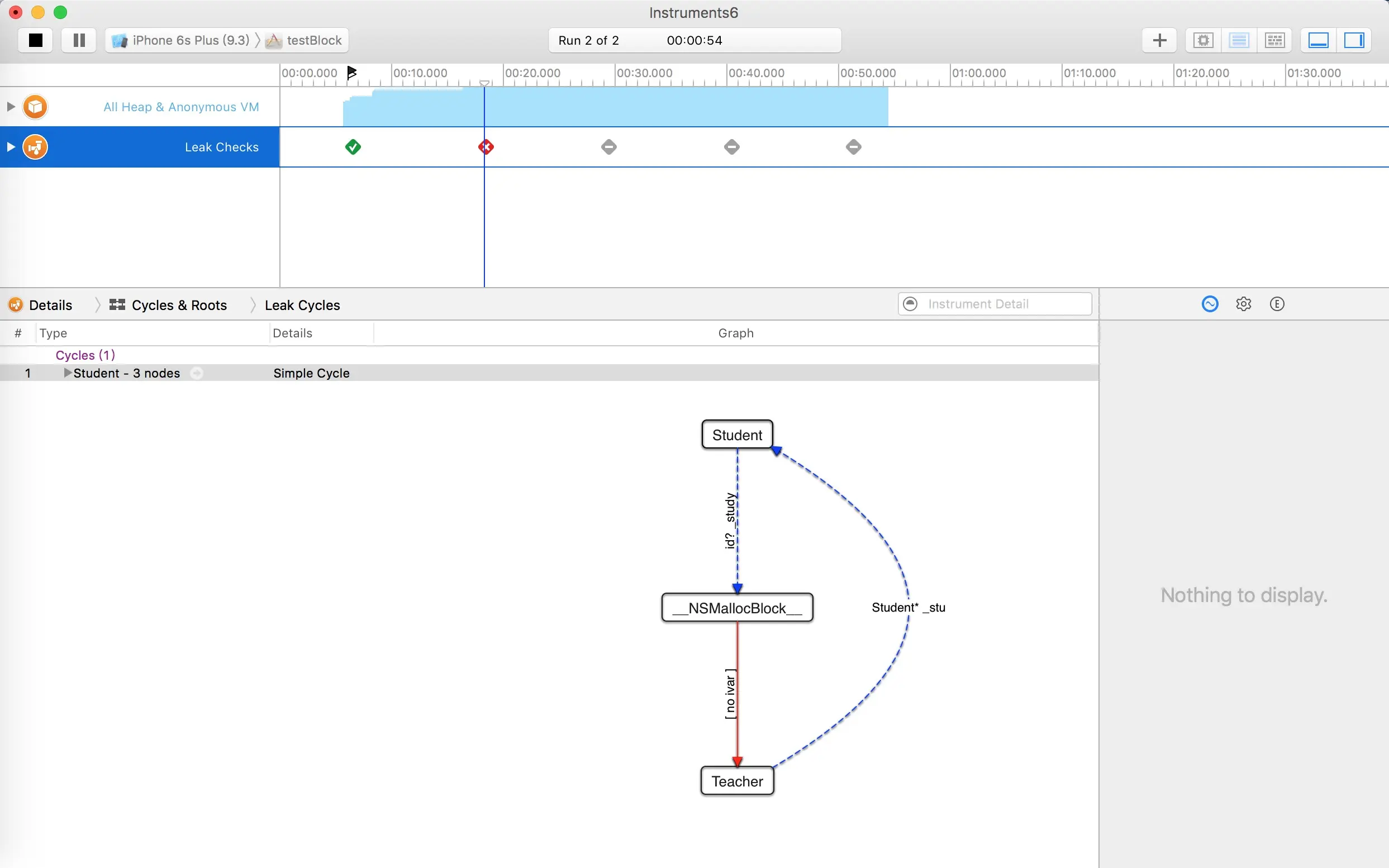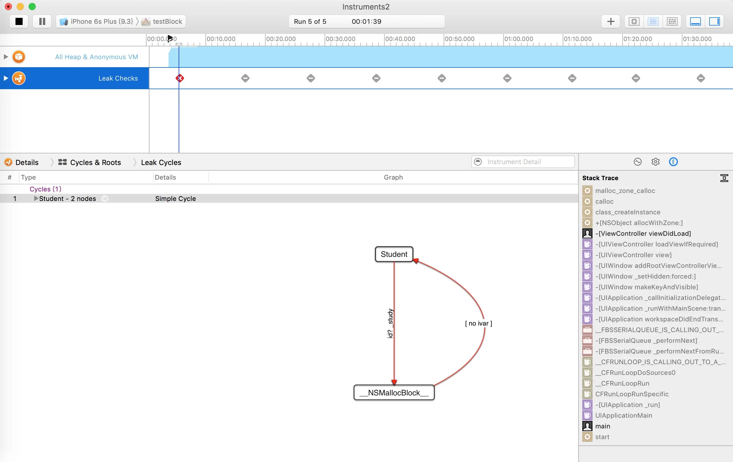 针对文章中给的例子3,大家都提出了疑问,为何没有检测出循环引用?其实这个例子有点不好。因为这个ViewController的引用计数一出来就是6,因为它被其他很多对象引用着。当然它是强引用了student,因为student的retainCount值是2。ViewController释放的时候才会把student的值减一。针对这个例子3,我重新抽取出中间的模型,重新举一个例子。