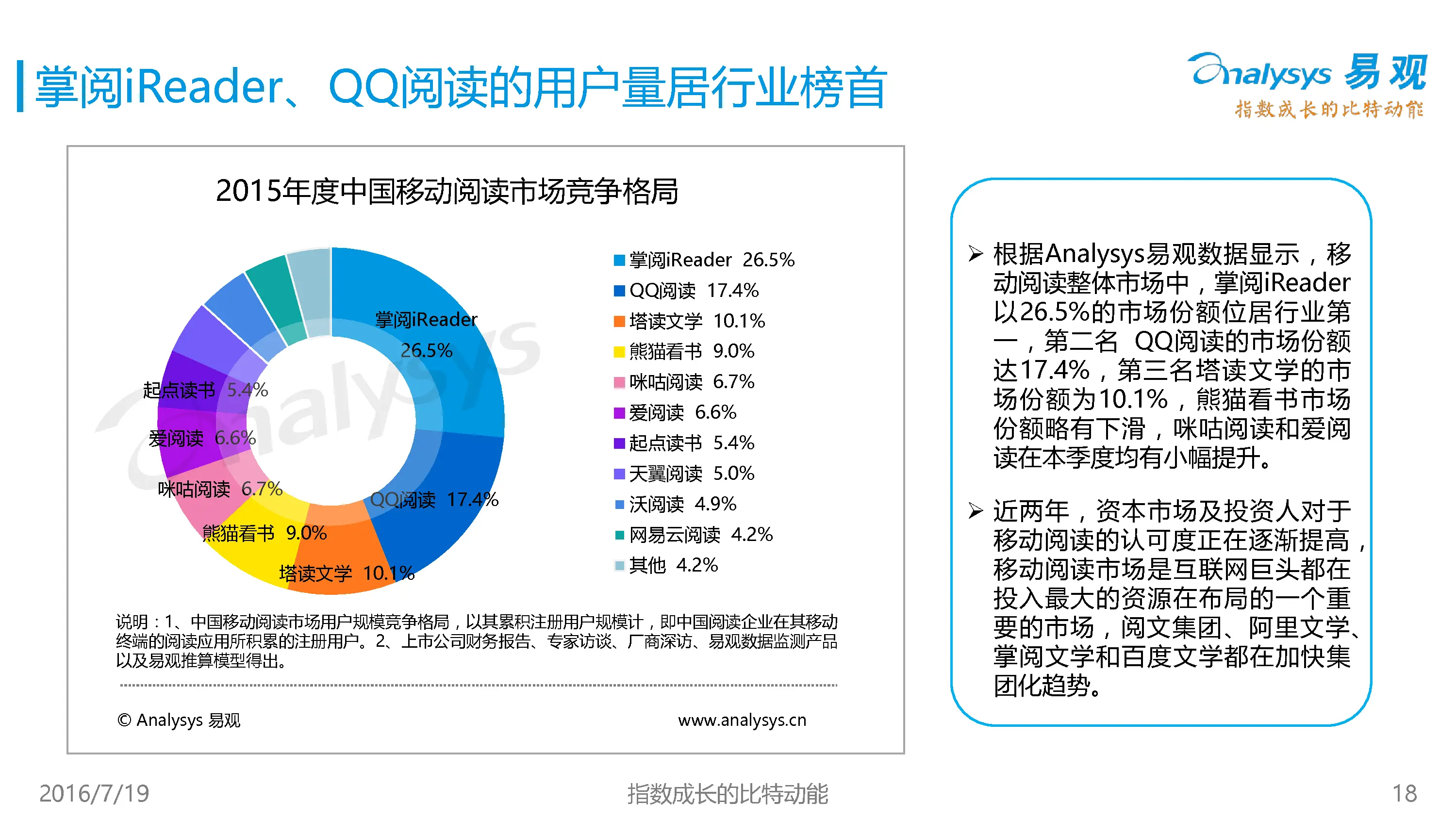 主要竞争对手有:QQ阅读、掌阅iReader、塔读文学、咪咕阅读 、爱阅读、起点读书、网易云阅读、以及电商品牌的kindle、当当阅读、京东阅读等;