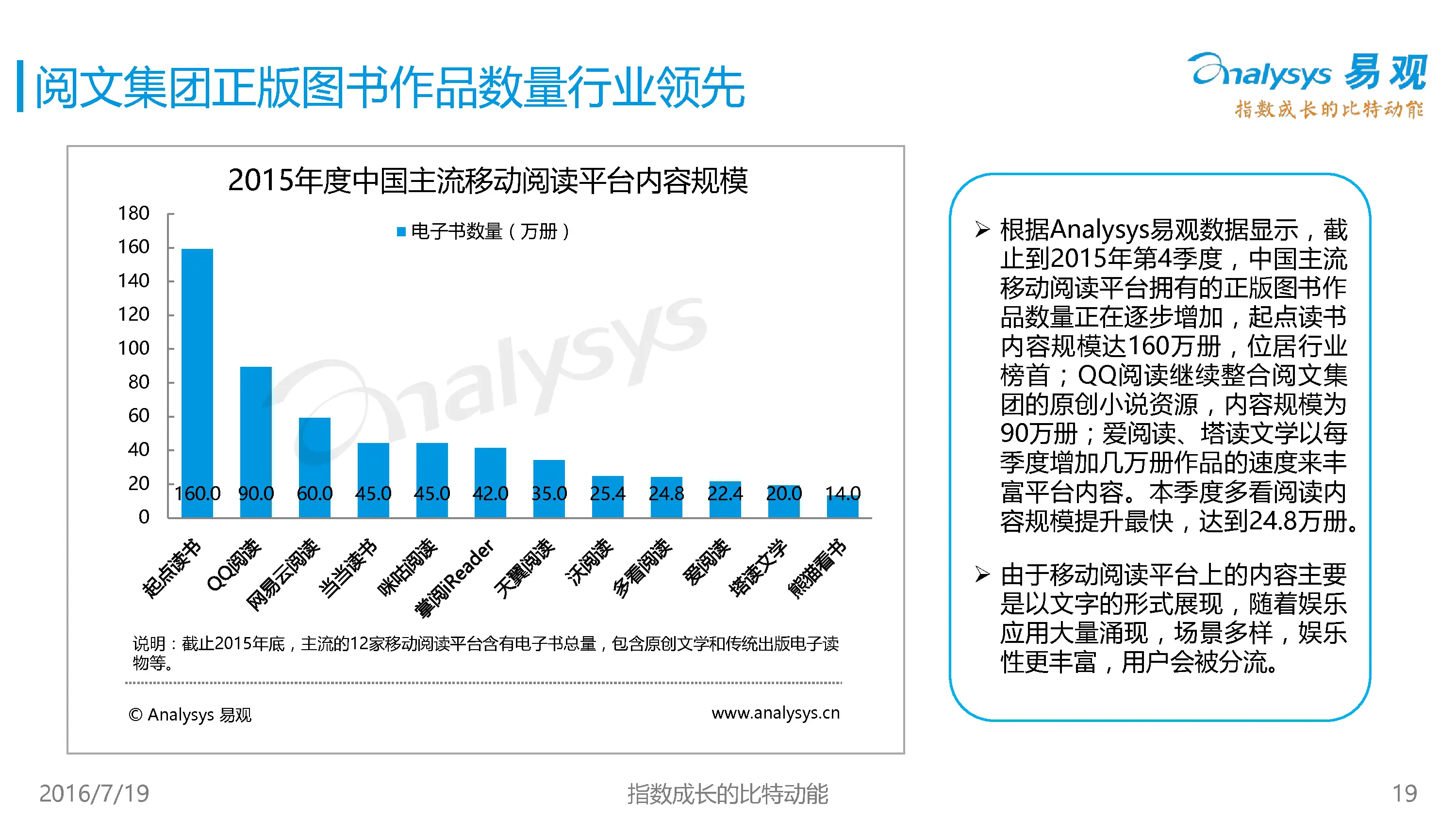 中国移动阅读市场竞争愈加激烈,行业竞争由早前只通过渠道资源、内容数量获取用户的阶段,已经进入到了泛娱乐产业链布局,为用户提供不同的产品形态和用户体验来提高用户的使用粘性。对于IP价值的深度开发,由单一的文学作品竞争已升级为泛娱乐集团的资源比拼中。