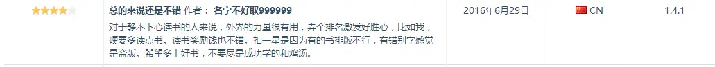 2)差评基本是因为书太少,阅读体验较专业的读书软件有差距、书太贵、回不到之前阅读的页面(我暂时没遇到此问题)等;