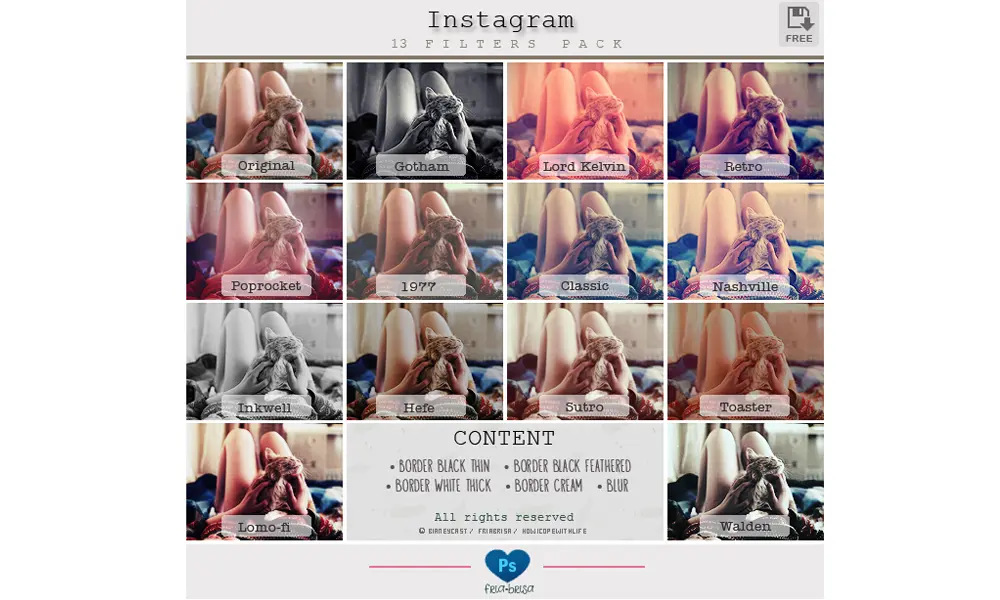 这是一组13个滤镜,可以在PS中帮你将图片制作成类似Instagram的效果。