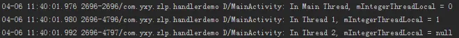 在以上代码中,我们在主线程中设置mIntegerThreadLocal的值为0,在Thread 1中该设置为1,而在Thread 2中未设置。我们看一下日志输出: