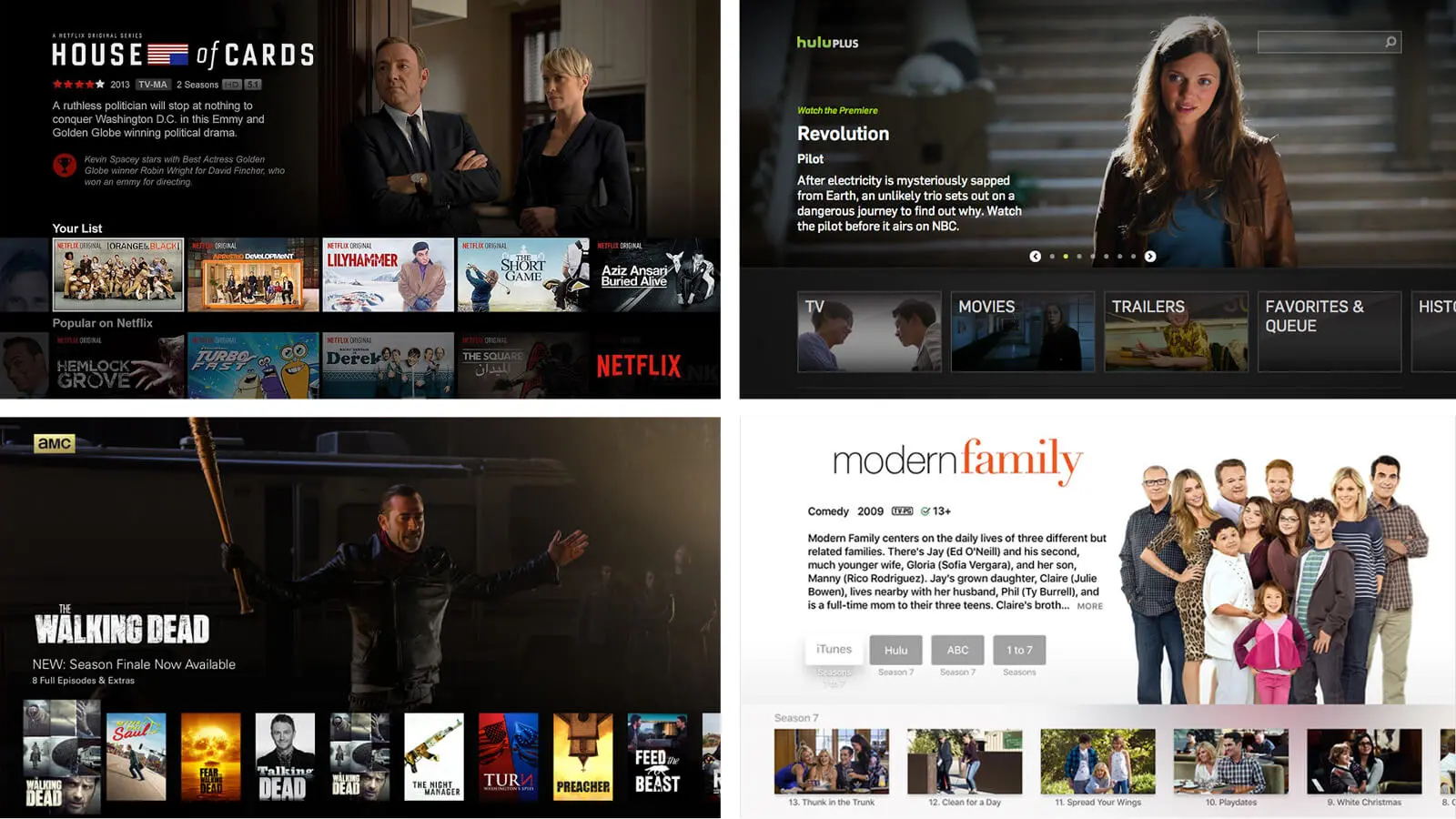 从左上图开始顺时针依次为:Netflix电视应用、Playstation上的Hulu Plus、Apple TV上的iTunes Store、Apple TV上的AMC
