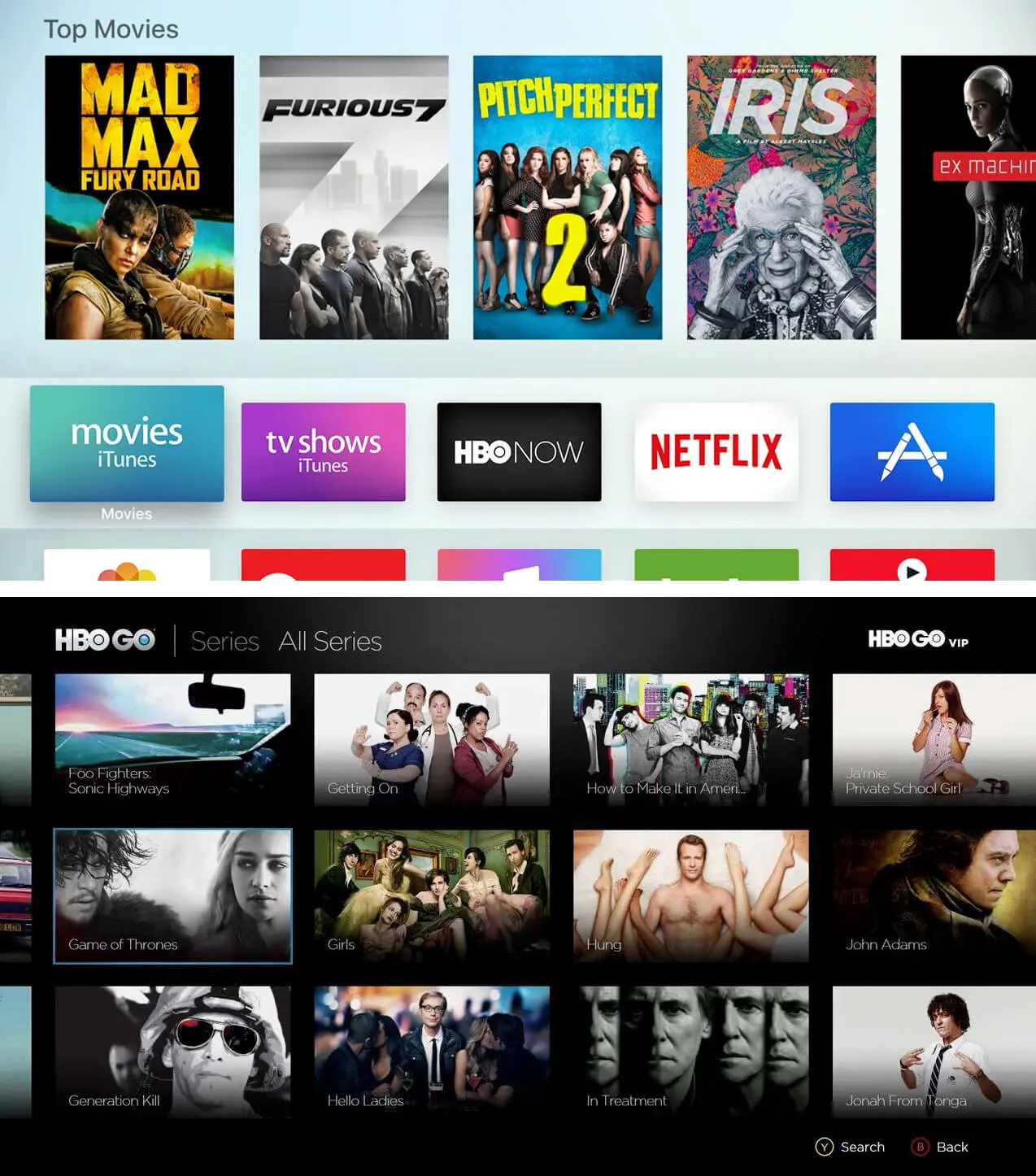 Apple TV(上)用了阴影和z轴位置表现鼠标指针,而HBO GO(下)使用了蓝色的边框