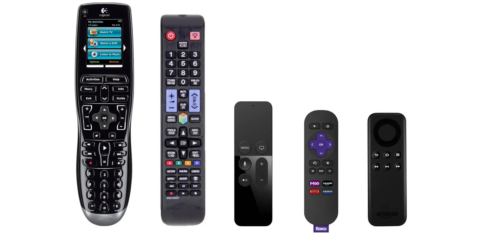 从左到右:Logitech Harmony、Samsung Smart TV、Apple TV、Roku、Amazon Fire TV