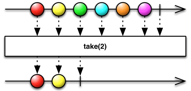 take(int)用一个整数n作为一个参数,从原始的序列中发射前n个元素.