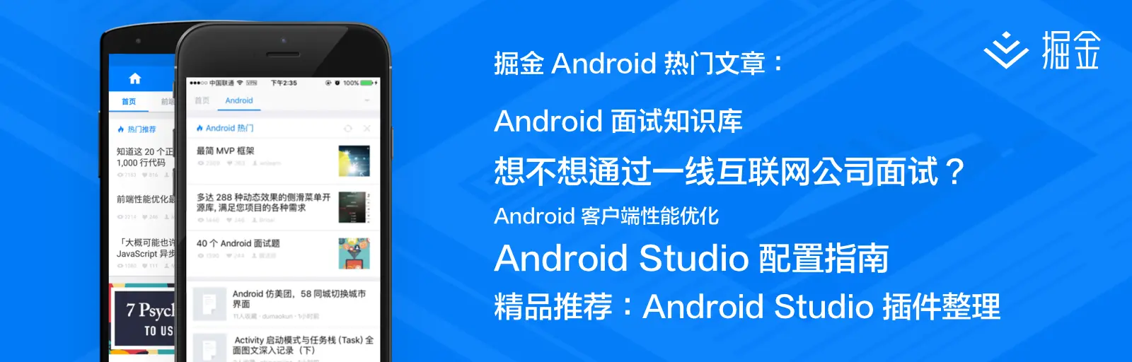 掘金 是一个高质量的技术社区,从 RxJava 到 React Native,性能优化到优秀开源库,让你不错过 Android 开发的每一个技术干货。各大应用市场搜索「掘金」,技术干货尽在掌握中。