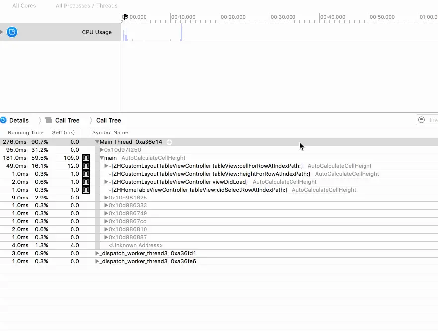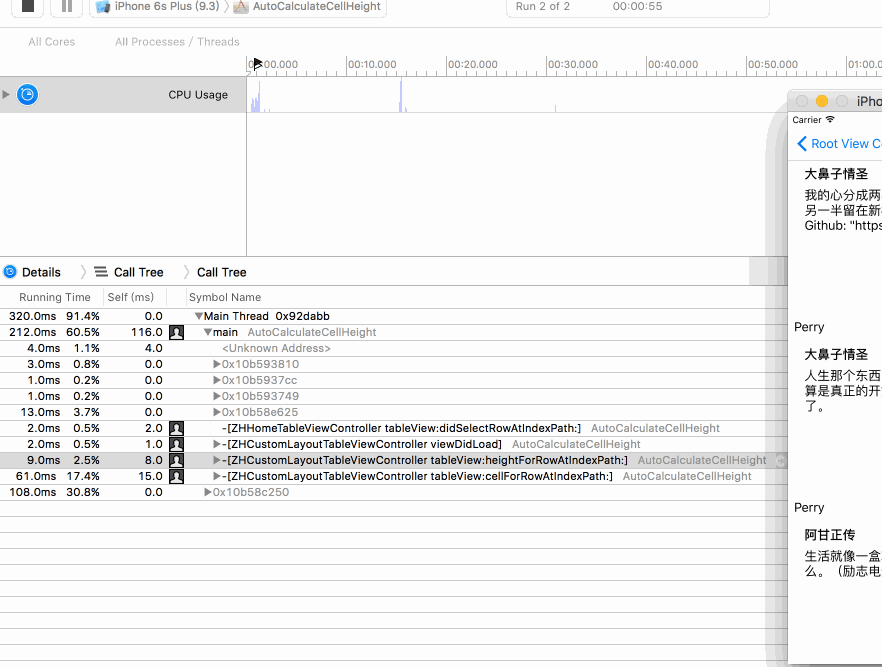 Cell高度提高性能!下面为大家讲述如何添加缓存提高性能!先看两张用Time Profiler测试的缓存前后的耗时对比: