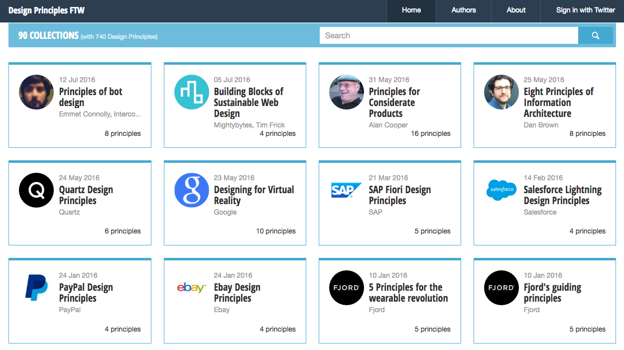 我们得出的结论是,我们需要建立一套设计原则。我成立了一个设计团队会议,并要求每个人都提出自己的想法。我推荐了一个网站叫 Design Principles FTW 来获取灵感。你可以在列表上查看到诸如谷歌, Facebook ,苹果等公司的设计原则。