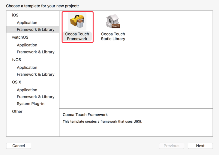 xcode->file->new->project选中iOS下的cocoa touch framework->next