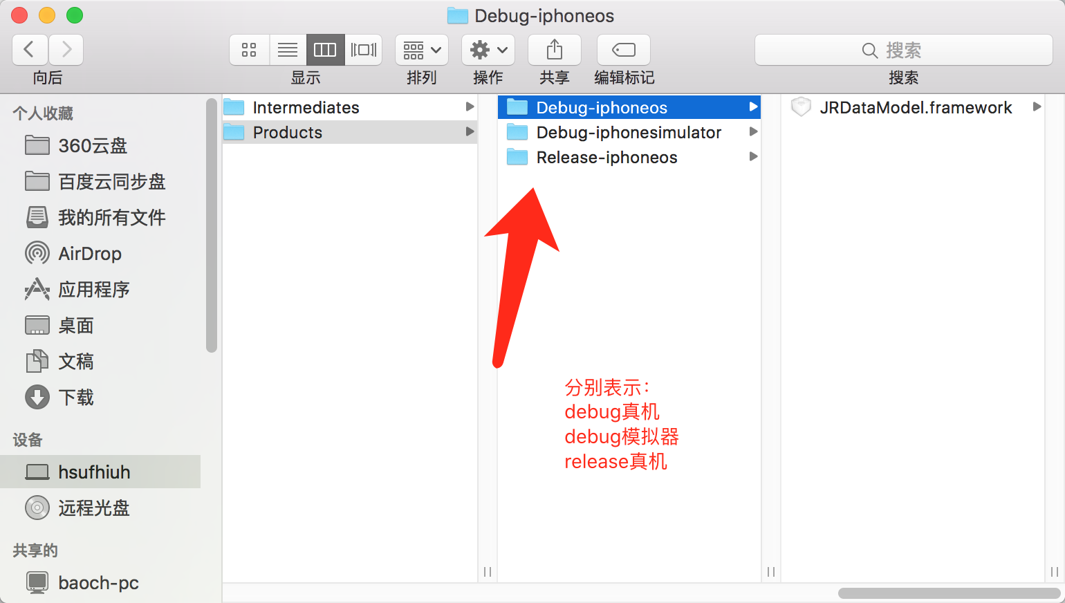 右击生成好的framework,选中show in finder可以查看framework在磁盘中的位置。进入目录以后,一般来说最多有四个目录,我这里只有三个(如下图)因为对于模拟器一般不会要release版本的。也可以通过finder,快捷键control+command+g输入~/Library/Developer/Xcode/DerivedData/Build/Products默认路径进入
