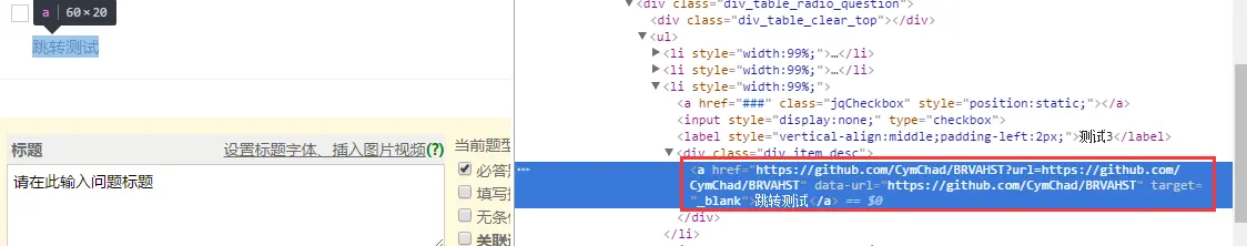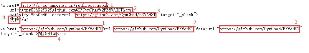 可以看到链接中是个a标签,href跳转http://r.sojump.net.cn/redirect.aspx,这个应该是跳转到的访问站外链接提示的那个网页,然后activity=9550646这个好像是创建的问卷,后面这个是我们要跳转的链接url=https%3A%2F%2Fgithub.com%2FCymChad%2FBRVAHST,然后data-url="https://github.com/CymChad/BRVAHST",这个不太清楚是啥子先不管,接下来是github.com/CymChad/BRV… `这个是展示在界面的文字,所以第二项和第一项的区别就在于展示的文字,看下面代码,区别就是文字的展示: