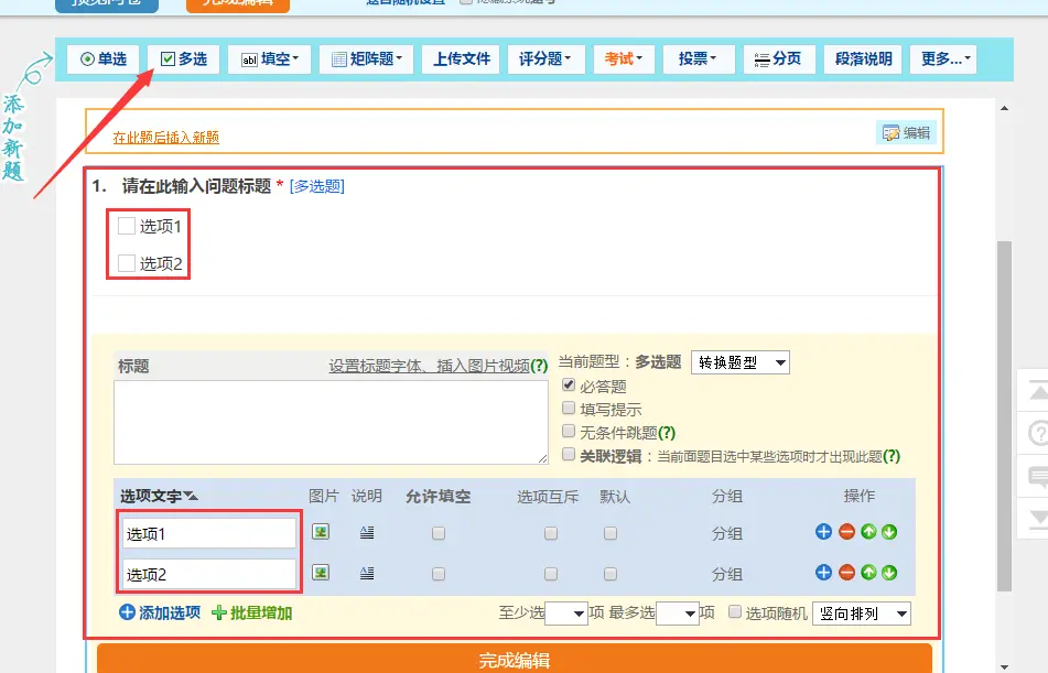 先创建好问卷,然后添加一个多项选择,现在有两项选择~
