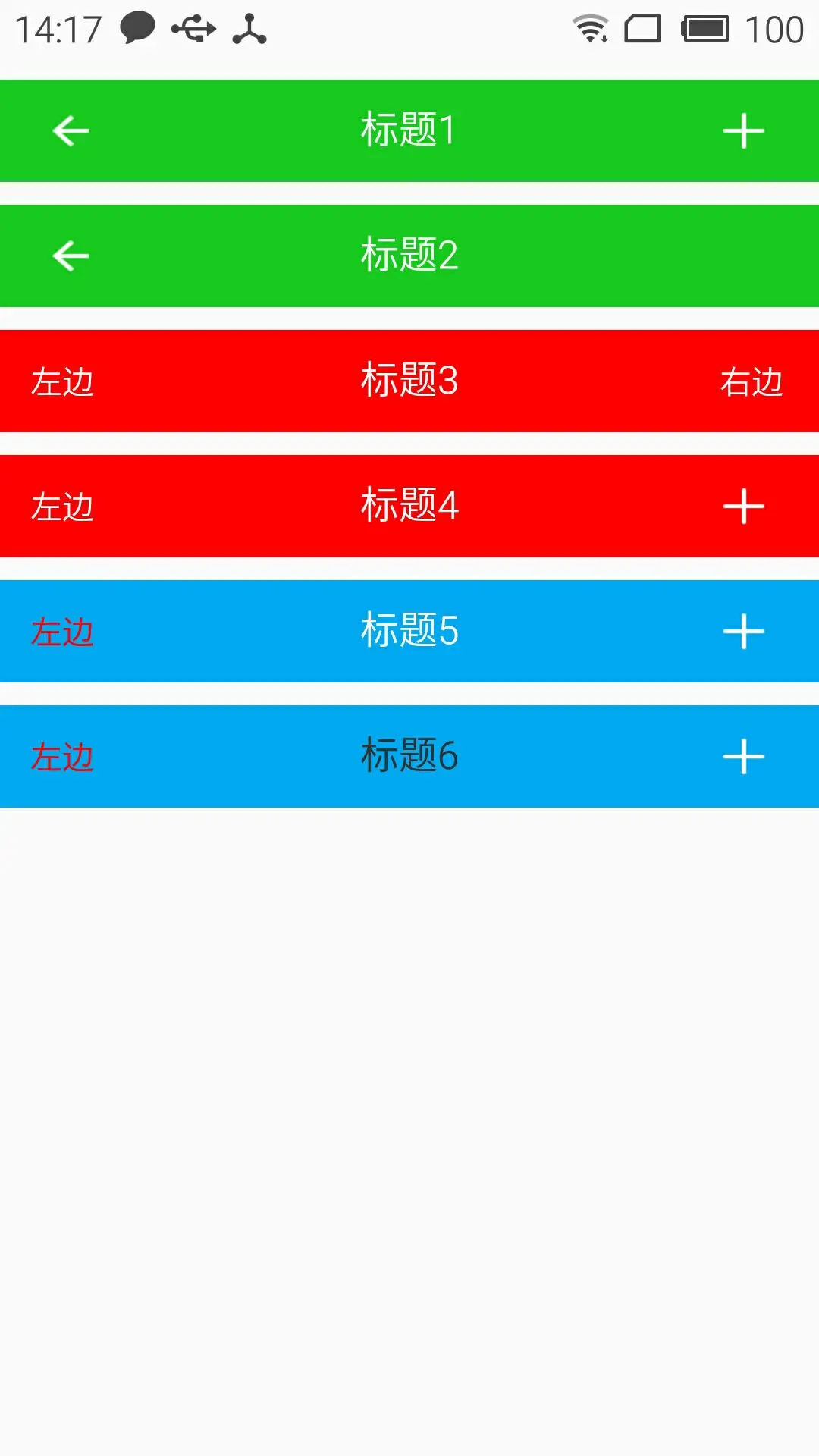 关于如何使用自定义属性这里就不再说明了,为了更加直观的查看效果,我这里在一个布局文件中实现不同要求的标题栏