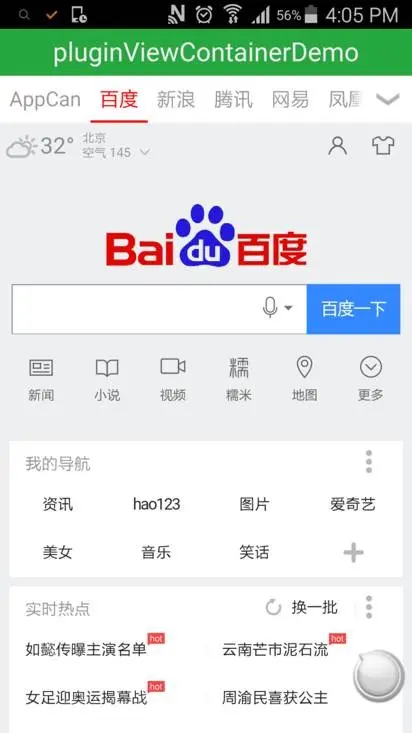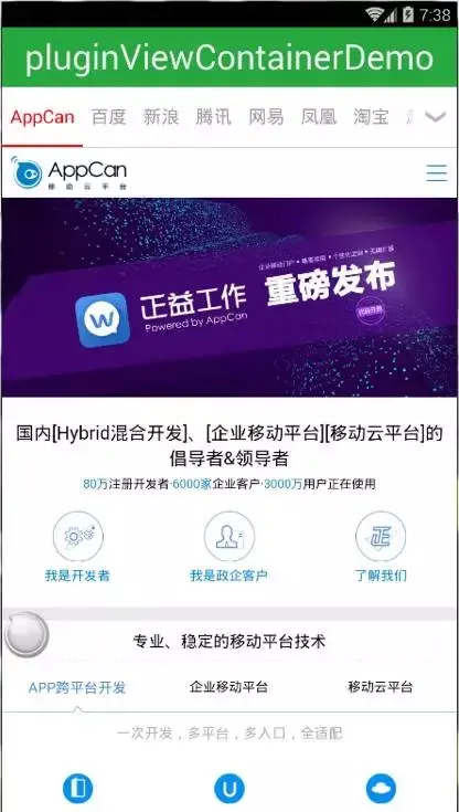 注:在创建插件容器之前,需要先定义容器id,方便对容器调用其他容器接口进行相关操作:var pluginViewContainerId = '998';这样整个程序就完成了。使用插件容器,可以很好的解决APP界面加载缓慢的问题。有这方面困扰的开发者,不妨按照本文的方法试试吧!联系我们客服热线:400-040-1766官网:http://www.appcan.cn