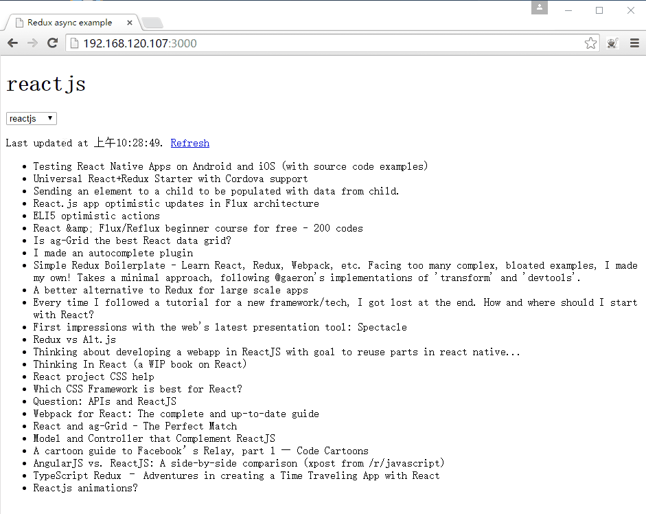 这个例子是官方的例子,主要是从Reddit中请求新闻列表来显示,可以切换react和frontend关键词来切换新闻列表,可以刷新当前新闻列表。
