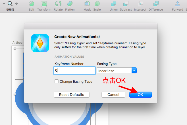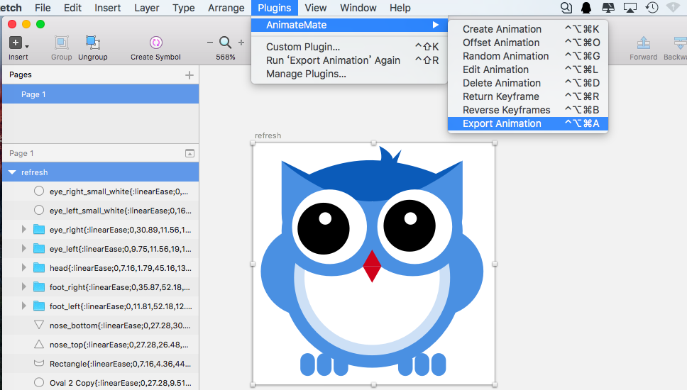 选中所有图层->plugins->AnimateMate->Creat Animateion,我们让这个猫头鹰的眼睛从0°旋转到359°分成20个关键帧。KeyframeNumber为20,EasyingType为线性动画linearEase,点击OK。