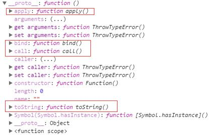 从上图我们看到经常使用到的一些方法如:apply,bing,call,这些方法到定义在Function.prototype之中,通过Function实例化的函数对象,自带一个__proto__属性指向该原型对象,所以通过函数对象可以访问到这些方法