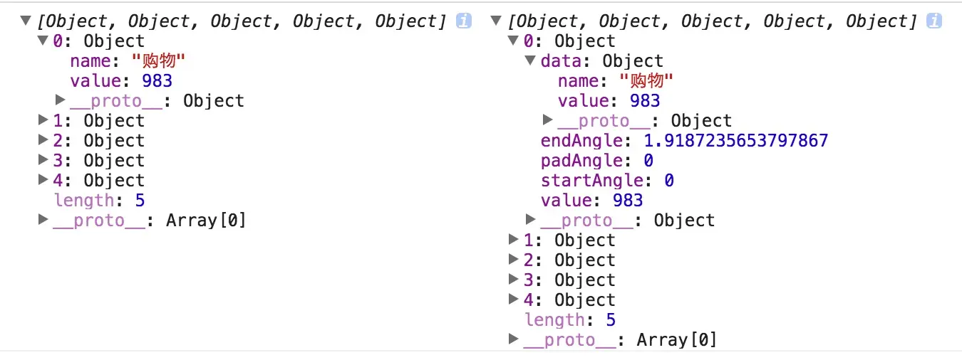 左边是转化前的原始的数据结构,右边是转化后的适合绘图的数据结构。可以看到,在保留原本的数据的基础上,转化后的数据新增了该项在整个饼图中的起始角度(startAngle和endAngle),以及弧形之间的间隙角度(padAngle)。