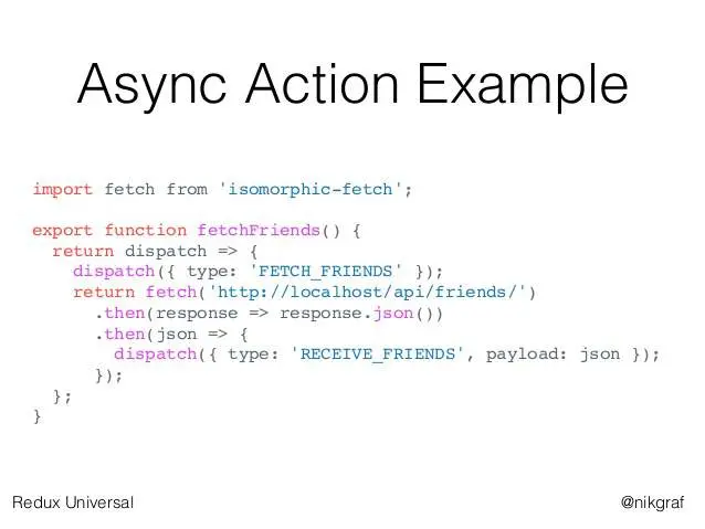 import { createAction } from 'redux-actions'; class AsyncApp extends Component { componentDidMount() { const { dispatch, selectedPost } = this.props // 发出同步 Action dispatch(requestPosts(selectedPost)); // 发出异步 Action dispatch(createAction( 'FETCH_POSTS', fetch(`/some/API/${postTitle}.json`) .then(response => response.json()) )); }
