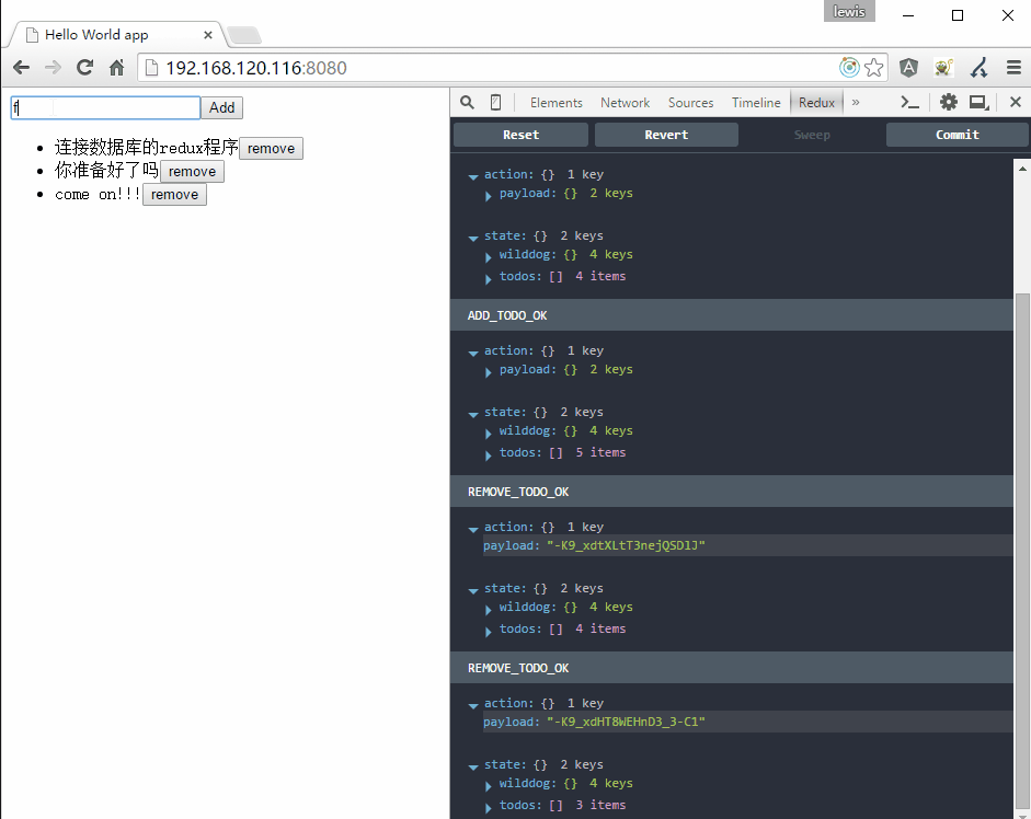 wilddog.child('todos').on('child_added') 这个方法定义了添加todo成功后的回调,我们执行了一个ADD_TODO_OK 的action,并把新的todo对象放在payload中返回给reducer。