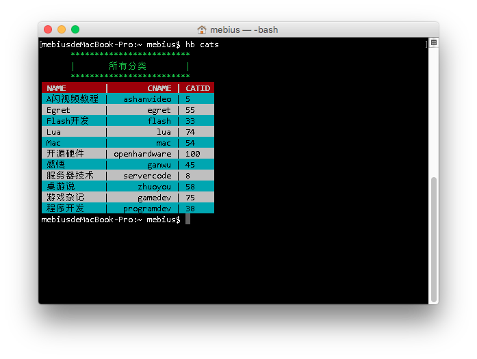 说到命令行管理方式,我们将后台管理全部以C/S架构实现。如果你想查看当前blog中的分类,可以使用 hb cats 命令。效果如图:
