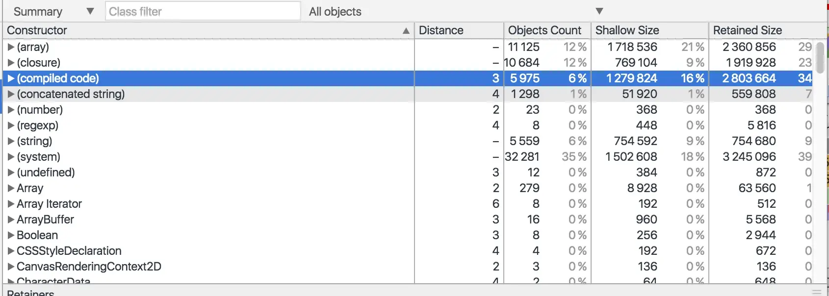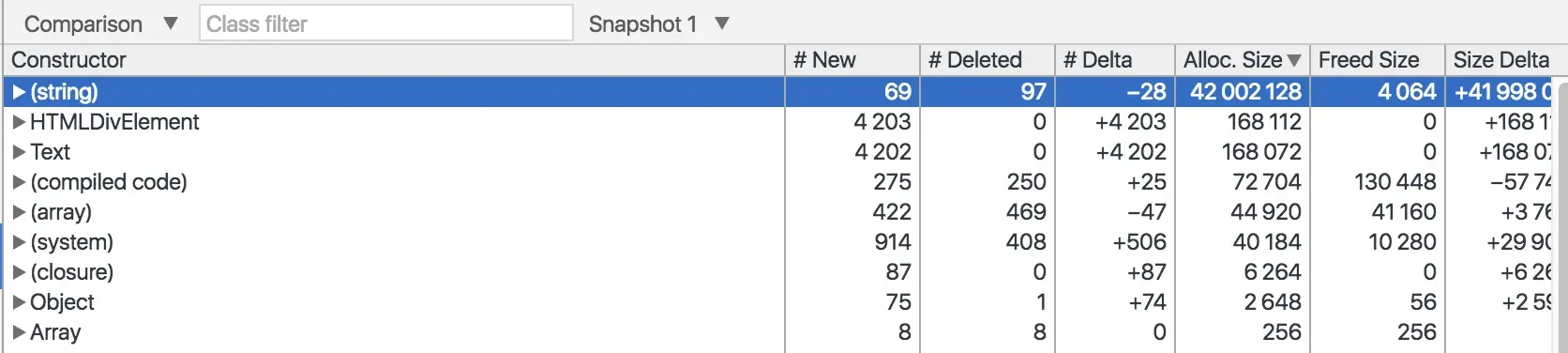 可以看到String&HTMLDivElement占有极大的内存,对比我们的代码确实是字符串和div的长期持有导致内存泄露