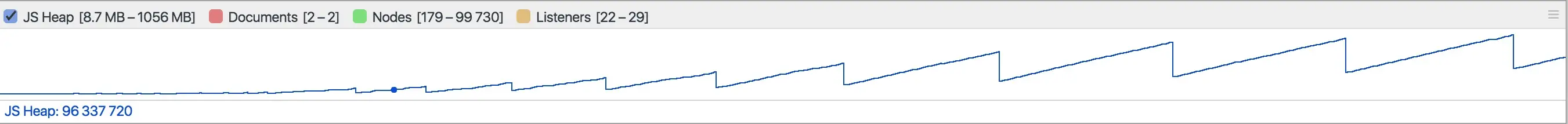 通过对比我们可以看到内存泄露有一个很明显的上扬曲线,而且不会随着时间和垃圾回收下降,这就证明有内存泄露的存在。