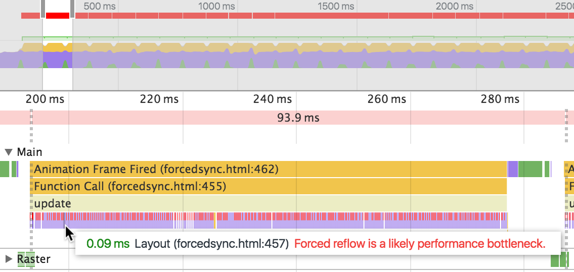 现在集中你的注意力,找到在update event下的紫色条,这些紫色条大部分都会有一个红色的标记,这警告的标志。鼠标放上去你会看到DevTools警告你的页面有forced reflow,强制浏览器重新布局