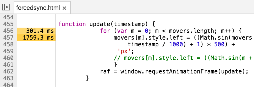 现在我们来看看引起forced reflow的函数,点击一个紫色柱子,在Summary面板你会看到这个事件的详细信息,点击Layout Forced (update @ forcedsync.html:457)跳转到函数定义的地方