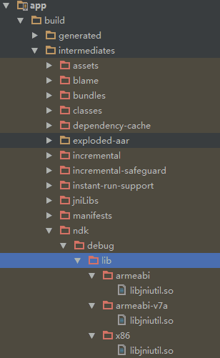 其中ndk标签是新添加的,moduleName 的值同样为System.loadLibrary("jniutil");的参数。由于配置了abiFilters,则只会得到armeabi、x86、armeabi-v7a三种ABI对应的.so文件。