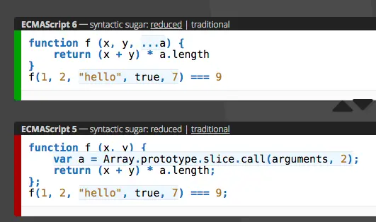 es6-features.org/ 这个网站列出了 JS 的 ES 6 和 ES 5 两个标准之间的具体差别,给出了大量代码示例来说明问题: