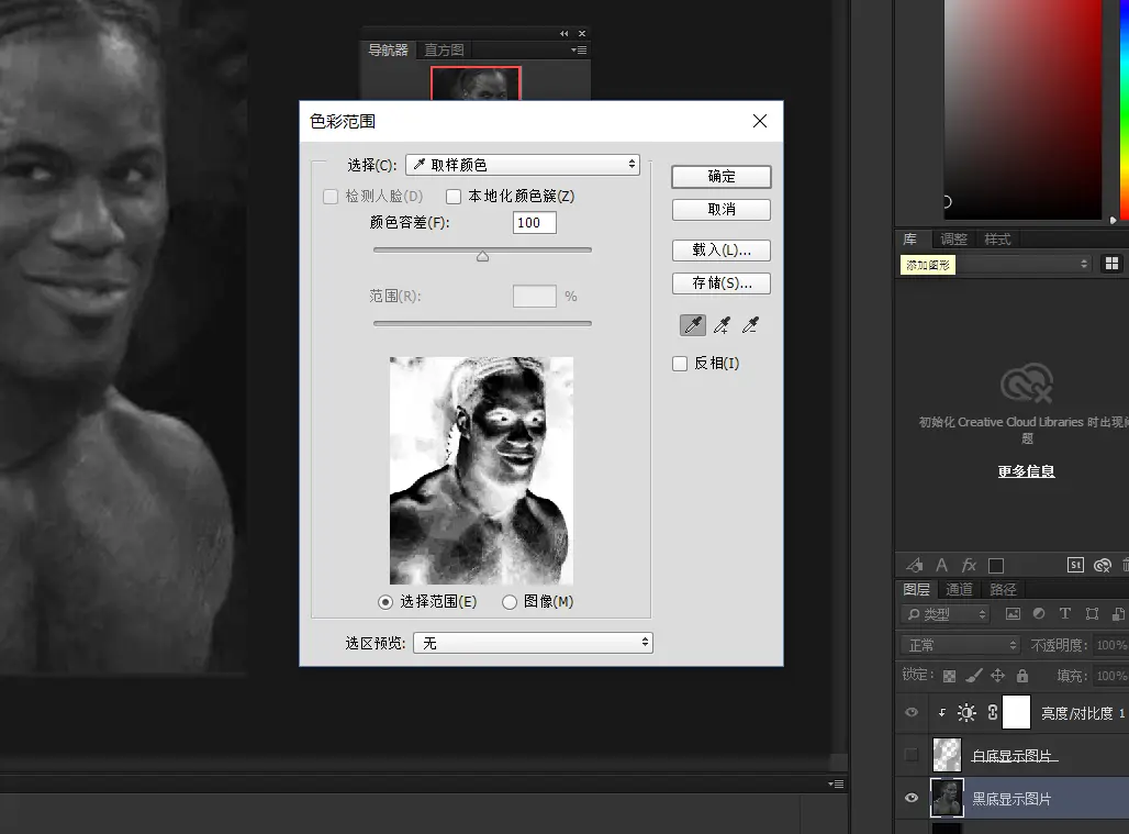 黑底其实和白底的处理过程是大概相同的。我们就需要把黑色部分(你也可以通过取样颜色取图片的黑色)去掉,以保证在背景为白色的时候,看不出来这个照片 则就是色彩范围选择的时候将颜色改成取样颜色,然后取黑色,如下这样