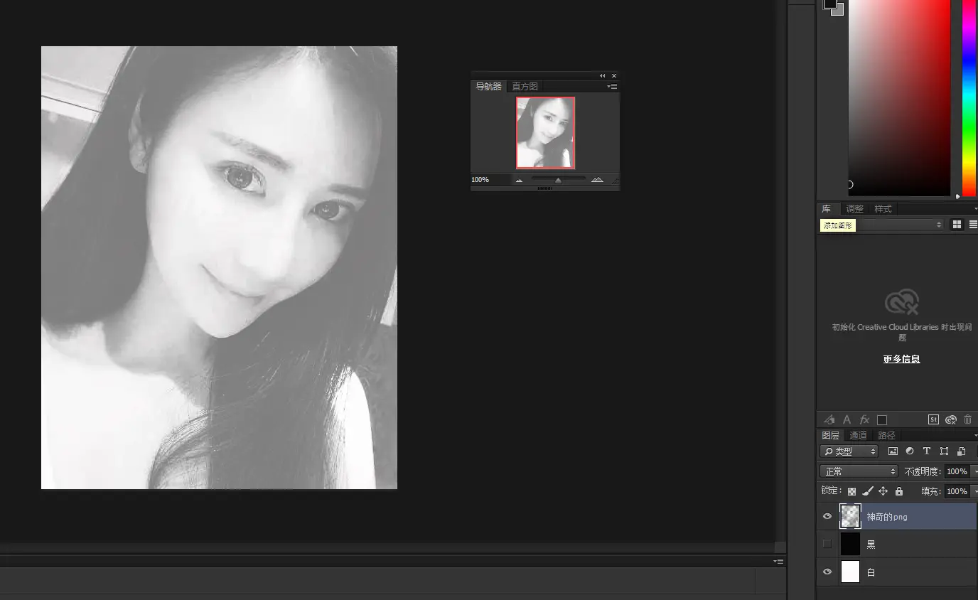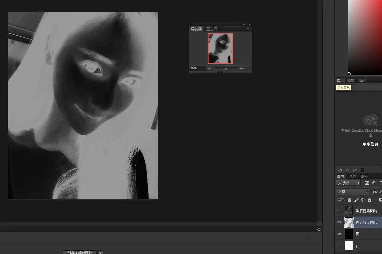 然后做几层应用到那个图层上,在那个调整图层和那个白底图层之间按住alt就可以把那个调整图层只应用到那个图层上(万分重要),最后做成的效果就是原来那个惊悚的女的消失在黑夜中